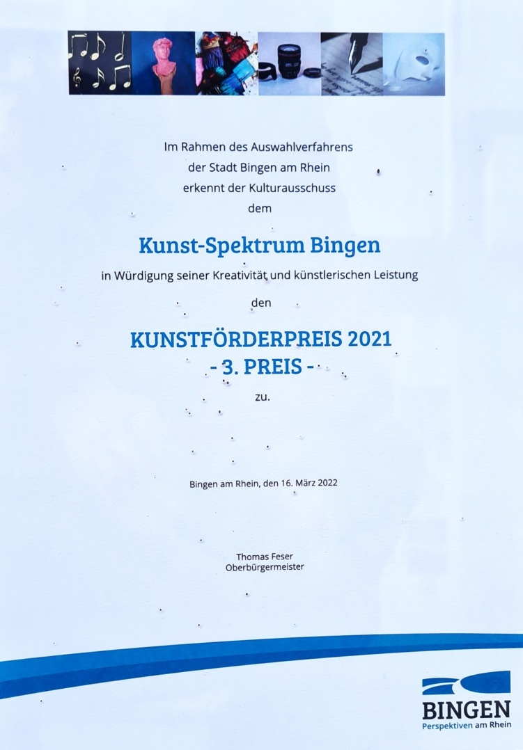Die aktuelle Entwicklung des Vereins erweitert den Gründungsgedanken, die Freizeit gemeinsam kreativ zu gestalten. Öffentliche Präsenz und die Vernetzung der Kunstschaffenden im Raum Bingen und darüber hinaus geben den Aktivitäten unseres Vereins eine neue Richtung. Der neue Name Kunst-Spektrum Bingen - kreativ am Rhein demonstriert die Verbundenheit des Vereins mit der Stadt und seine Offenheit für die Vielfalt der Binger Kunstszene.